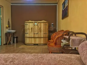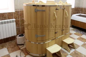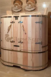Двухместная фитобочка из кедра - это парная, в которой удобно принимать процедуры двум людям. Она оборудована откидными створками, дверцей, отверстием для головы и перегородкой (по желанию). Толщина стенок составляет 25 мм. Во время парения человек находится внутри кедровой бочки, а голова снаружи. Благодаря этому исключается возможность перегрева. Подлокотники из кедра и внутренние ручки делают эксплуатацию фитобочки более удобной.