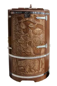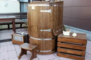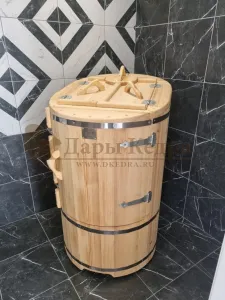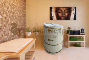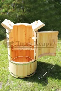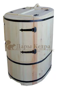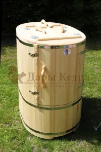 Овальная фитобочка из кедра - это мини парная, которую можно использовать не только в спа-салонах, но и дома. Овальная модель более просторна и удобна в использовании. Толщина стенок составляет 25 мм. Верхний скос делает положение головы более комфортным и улучшает обзор. Она оборудована откидными створками, дверцей и отверстием для головы. Во время парения человек сидит внутри кедровой бочки, а голова находится снаружи. Благодаря этому исключается возможность перегрева. Подлокотники из кедра, встроенные ручки на створках и двери делают эксплуатацию более удобной.