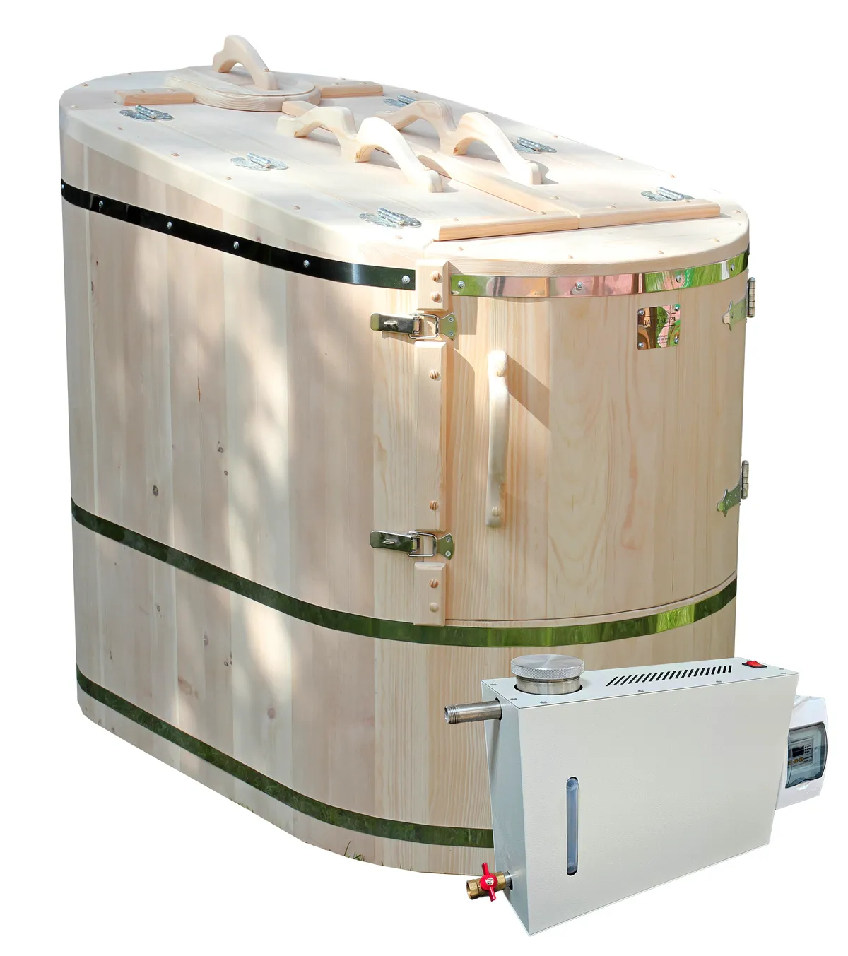 Готовый комплект «Удобный»: кедровая бочка с парогенератором + био-защита изнутри и снаружи Готовый комплект - это полностью укомплектованный набор с фитобочкой для процедур парения. Овальная модель более просторна и удобна в использовании. Толщина стенок составляет 25 мм. Фитобочка оборудована откидными створками, дверцей и отверстием для головы. Во время парения человек сидит внутри кедровой бочки, а голова находится снаружи. Благодаря этому исключается возможность перегрева. Подлокотники из кедра, встроенные ручки на створках и двери делают эксплуатацию более удобной. Парение в фитобочке благотворно влияет на организм в целом: повышается иммунитет, выводятся шлаки и токсины, улучшается работа органов тела и состояние кожи.